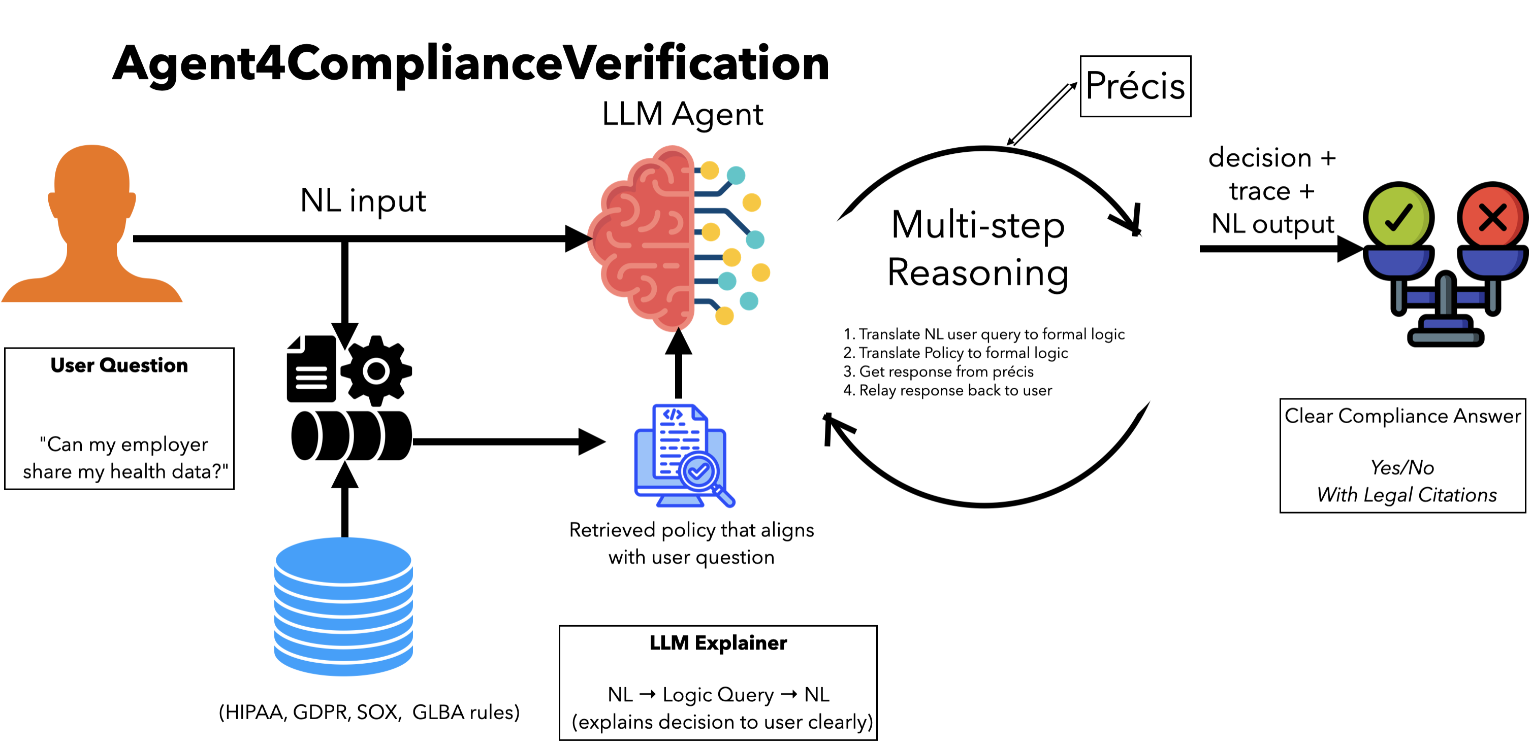 An autonomous agent that translates natural language policy queries into formal logic and verifies compliance across HIPAA, GDPR, SOX, and GLBA regulations.